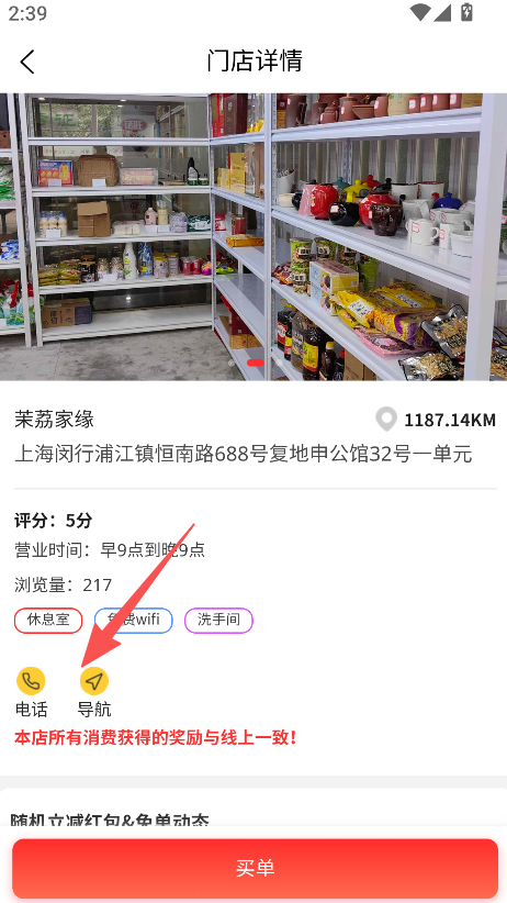 3、在门店详情页,点击导航,获取前往路线,或进行买单操作。