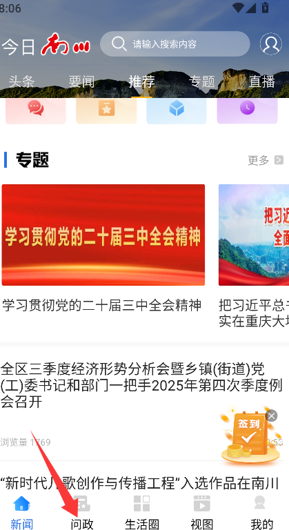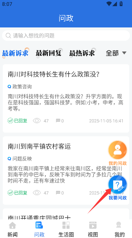 1、在应用主页找到并点击“问政”入口,即可进入民生事务沟通版块。