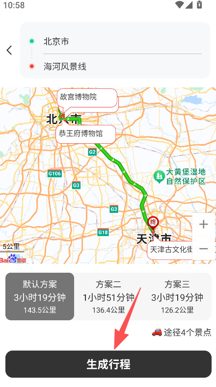 3、实现行程生成功能,多路线方案及景点推荐可查,用户获取自驾路线,出行规划有保障。