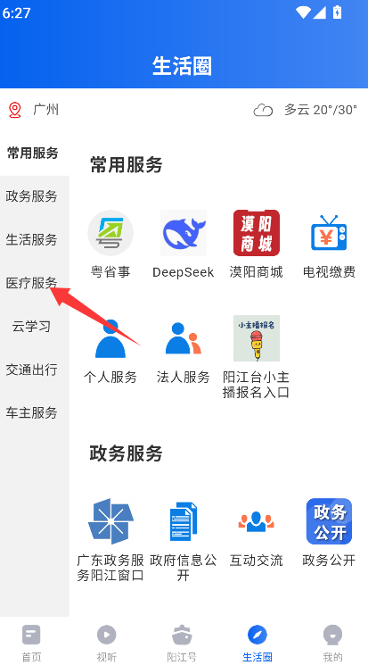 2、在分类服务列表中浏览并选择“医疗服务”选项,点击进入医疗健康服务专区。