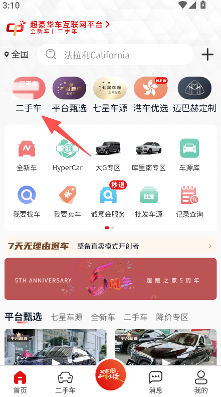 2、板块分类专业,二手车、平台甄选、大G专区等,分类清晰,助力用户精准筛选超跑车型。