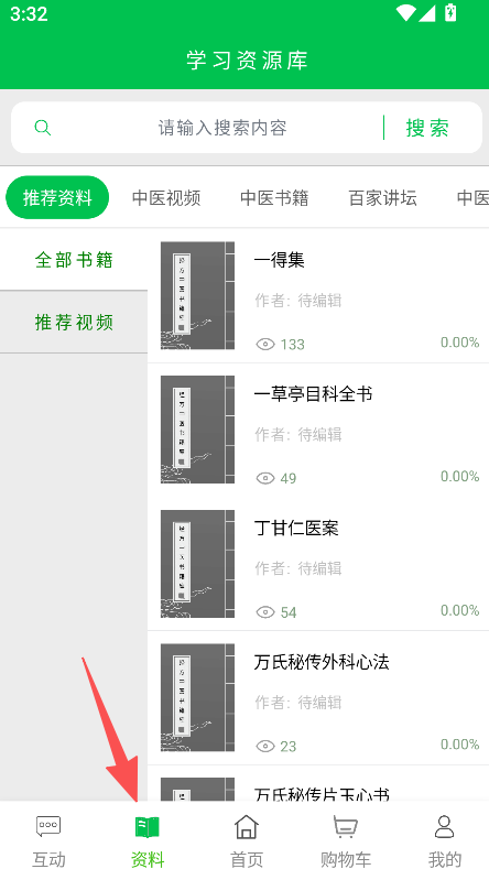 1、具备资源库功能,中医书籍、视频可选,用户定位学习资源,学习方向明确。