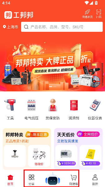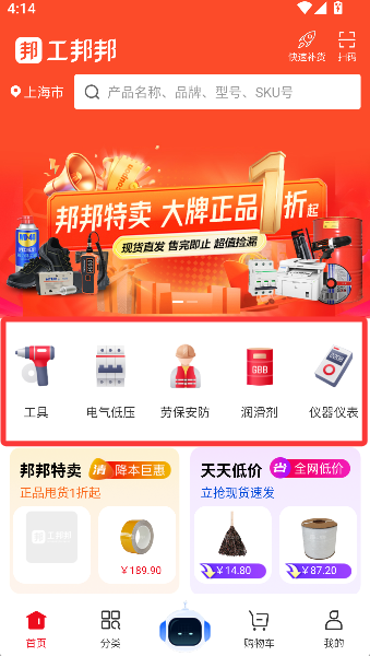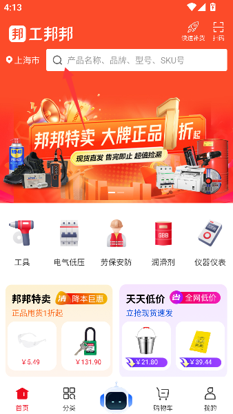 2、页面中央整齐排列着工具、劳保安防等彩色板块,宛如一个随时待命的工业品装备补给区。