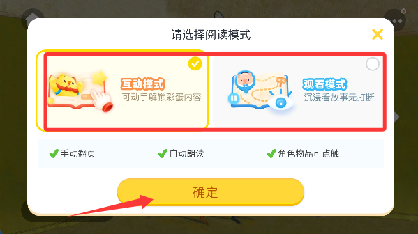 1、绘本阅读与互动,提供超过500本原创互动绘本,支持自动播放、自主阅读、跟读三种模式。