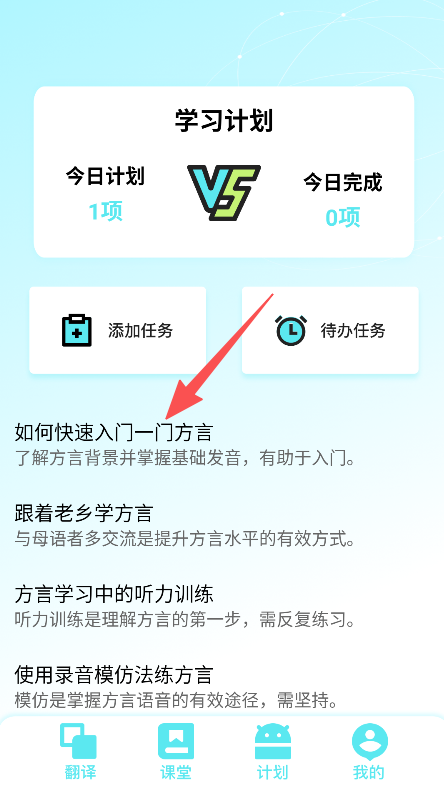 3、进入计划板块,查看方言学习内容,制定学习任务。