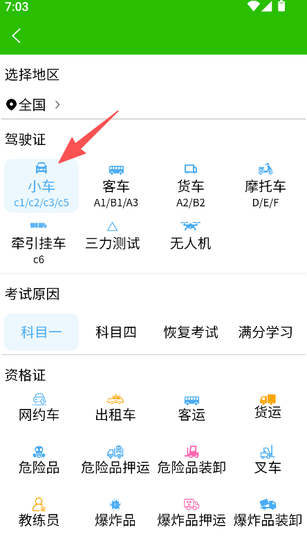 1、具备车型选择功能,多车型分类明确,学员选择对应车型,驾考备考方向精准。