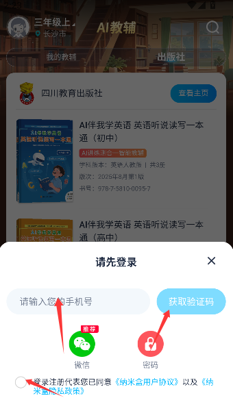 3、输入手机号获取验证码并勾选协议,这个简单的步骤如同领取一张安全通行证,确保学习旅程安心启航。