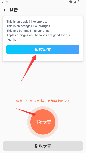 3、既可点击播放聆听地道原文,也可勇敢按下录音键开始跟读,一场与原声的模仿秀即刻上演。