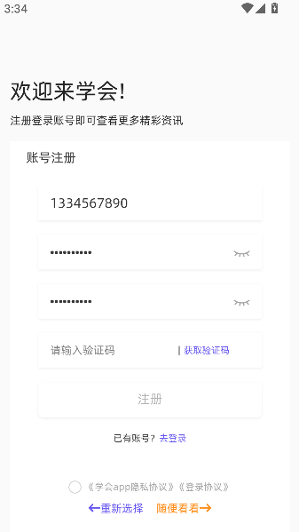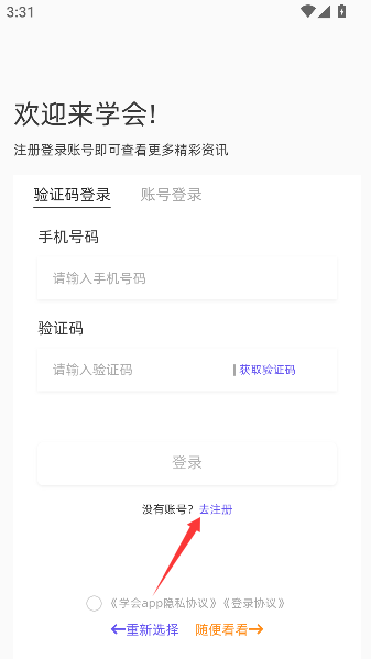 1、轻点《学会》应用图标,在欢迎页面上找到那个充满邀请意味的“去注册”按钮,轻轻一按,便开启了构建个人知识库的旅程。