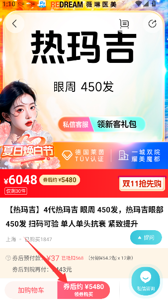 3、当心中疑虑一扫而空,便果断点击那个诱人的领券按钮,为接下来的美丽旅程解锁专属礼包。