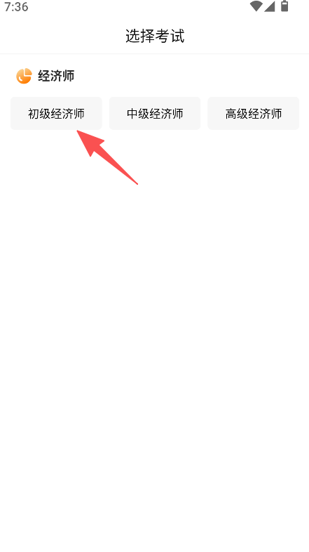 1、进入选择考试页面,点击初级经济师(或中级、高级)。