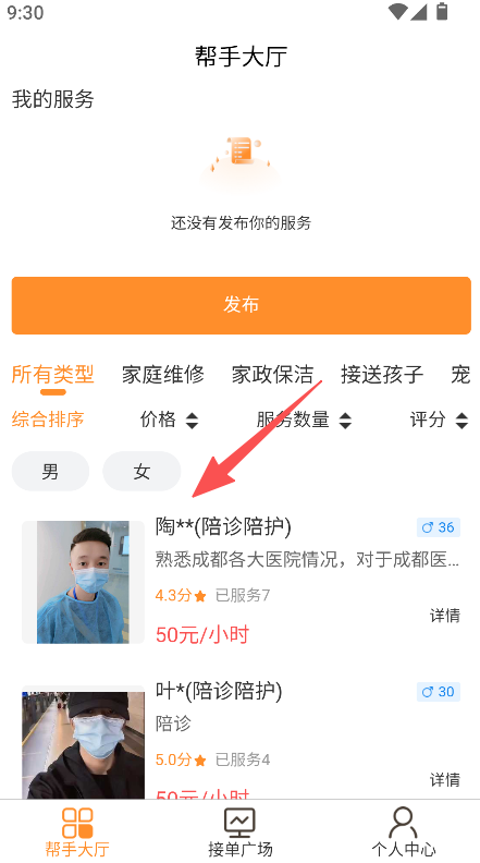 1、进入帮手大厅,选择所需服务类型,浏览帮手列表。