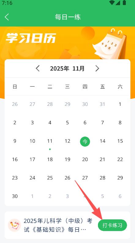 2、在每日一练的学习日历中选择日期,点击“打卡练习”进入做题环节。