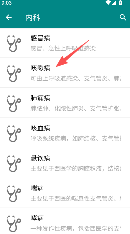 2、支持病症查询功能,在科室下选择具体病症,即可查看该病症的详细信息,包括简介、备注等。