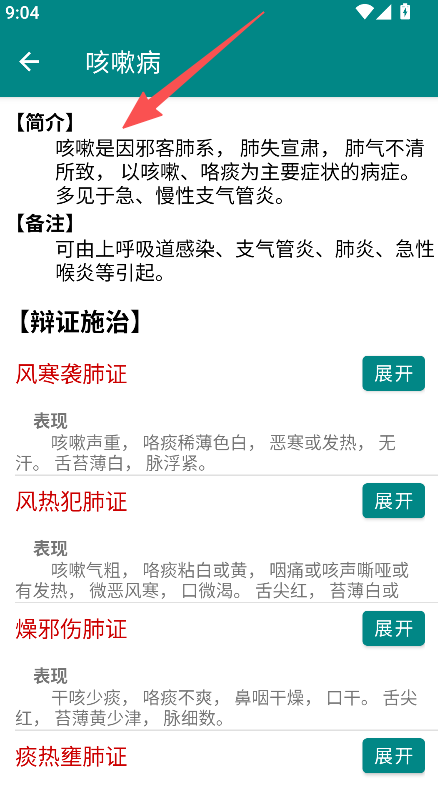 3、查看病症简介、备注及辩证施治内容,了解详细信息。