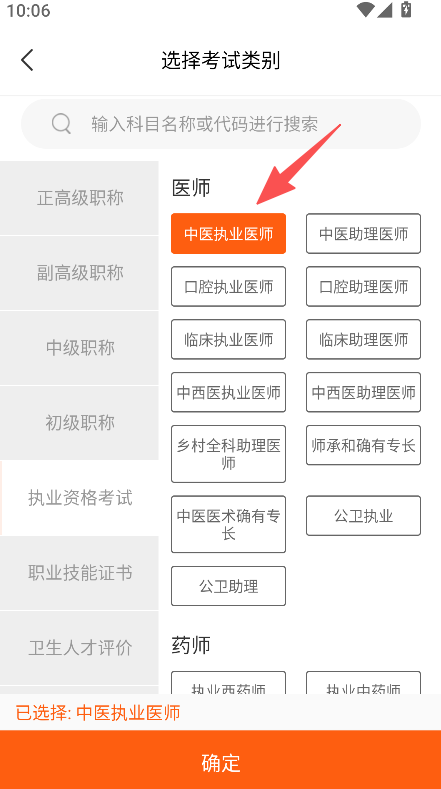 1、进入选择考试类别页面,选择对应医考类别,点击确定。