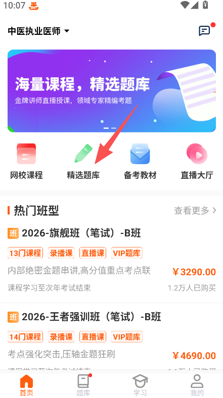 2、进入首页,选择精选题库或网校课程,开始学习或刷题。