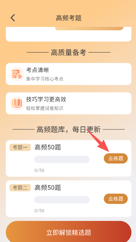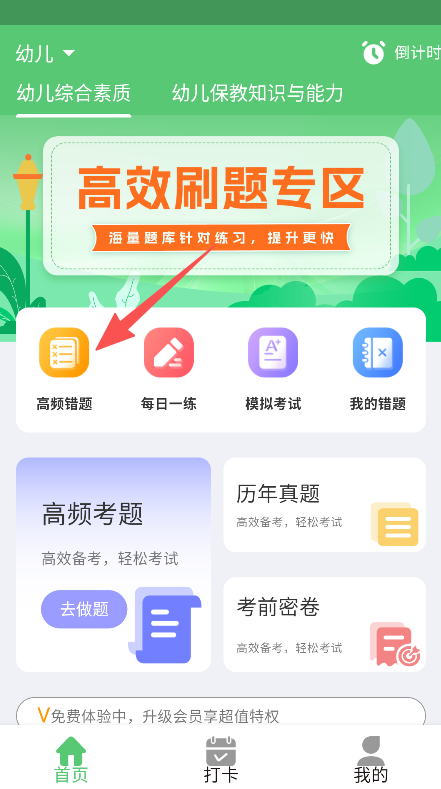 2、设置高效刷题专区,涵盖高频错题、每日一练、模拟考试等板块,为考生提供多维度的刷题资源,助力全面备考。