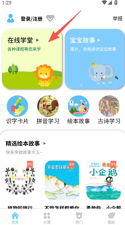 1、聚焦儿童汉字启蒙,设置在线学堂板块,按年级划分汉字课程,课程体系清晰有序,满足不同阶段宝宝汉字学习需要。