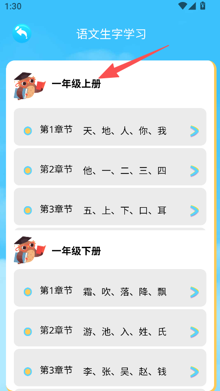 2、进入语文生字学习,选择年级上册或下册,点击章节开始学习。
