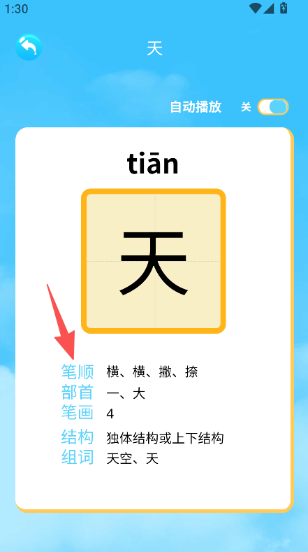 2、生字学习页面信息极为全面,将笔顺、部首、笔画等关键知识点集中展示,宝宝可直观且系统地学习汉字。