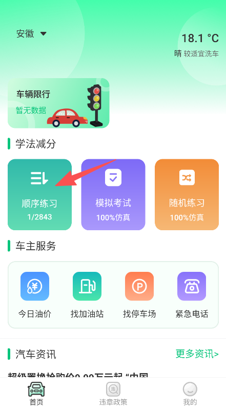 1、聚焦违章知识学习与车主服务,整合学法减分的顺序、模拟、随机三种练习模式,同时涵盖油价、加油站等车主实用服务。