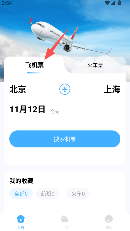 1、打开软件,选择飞机票板块,设置出发地、目的地及出行日期。