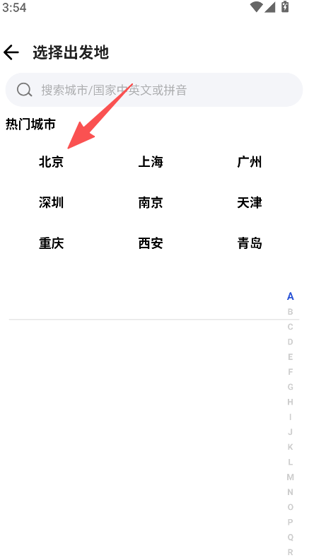 2、进入选择出发地页面,可从热门城市中选择或搜索城市。