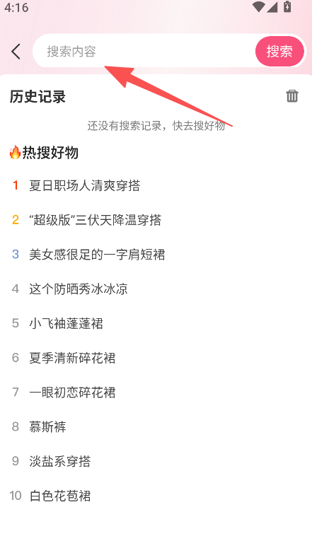 1、打开软件,点击搜索框,输入关键词或选择热搜好物搜索商品。