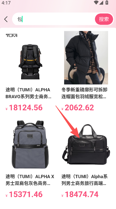 2、商品搜索结果精准,输入关键词后快速呈现相关商品,如输“包”可展示各类箱包,用户无需过多筛选即可找到所需。