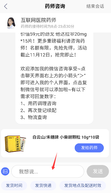 3、在输入框中具体描述用药疑问,最后点击“发送”按钮即可将问题提交给专业药师进行咨询。