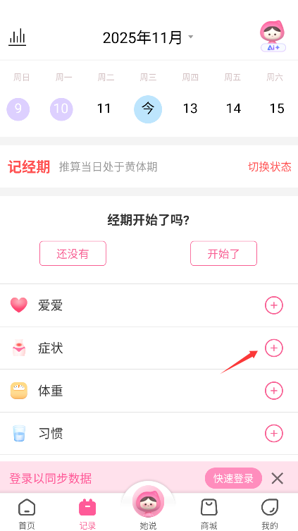 2、浏览各项可记录的身体指标,在“症状”栏目的右侧找到并点击其“+”号添加图标。