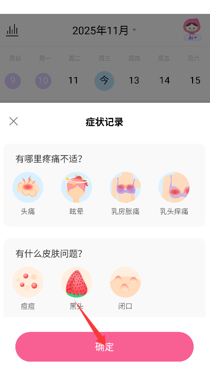 3、从中勾选当前对应的症状,最后点击“确定”按钮即可完成本次记录。