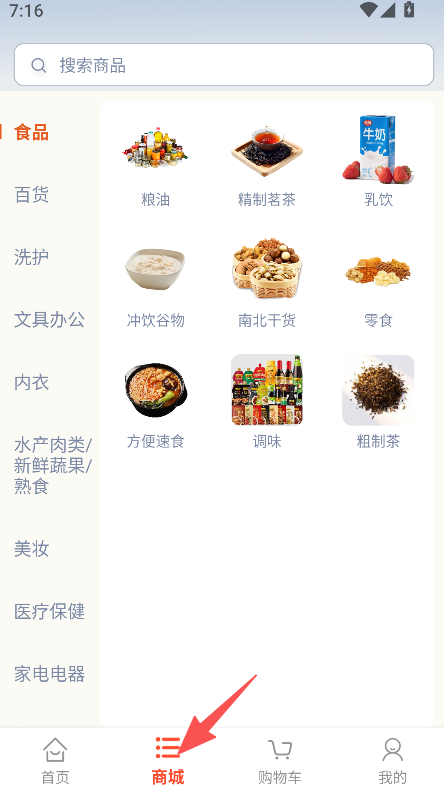 1、打开软件,点击商城,浏览食品、百货等多品类国货商品。
