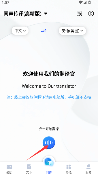1、手指轻点界面上那个像蓝宝石般的按钮,翻译世界的大门便应声开启,等待指令的输入。