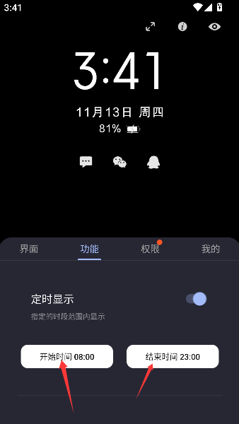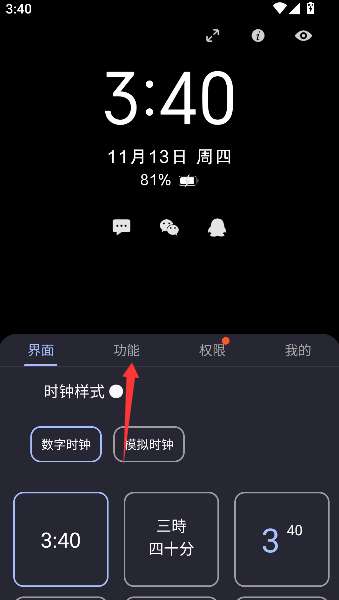 1、轻点软件首页的"功能"按钮,仿佛打开了通往个性化息屏世界的魔法控制台。