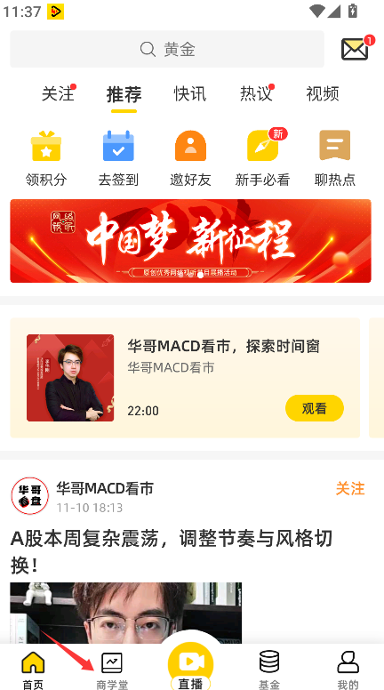 1、通过底部或侧边导航栏找到并点击“商学堂”入口,进入课程中心。