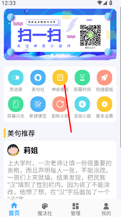 1、打开《神奇小部件》软件进入首页,在功能模块中找到 “神奇便签” 选项,点击后进入便签管理主界面。