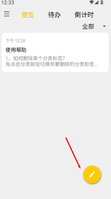2、在便签管理界面的右下角,找到带有黄色圆圈的笔状图标并点击,进入新便签创建编辑页面。