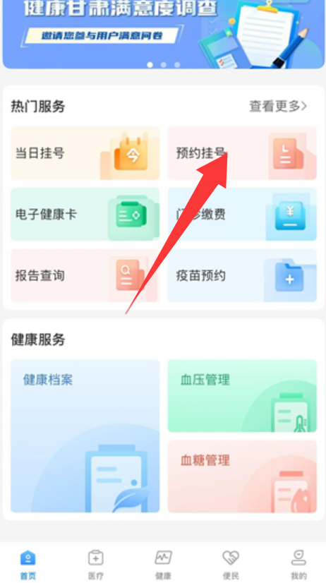 1、在首页界面找到"热门服务"或类似的功能板块,在其中定位并点击"预约挂号"图标。