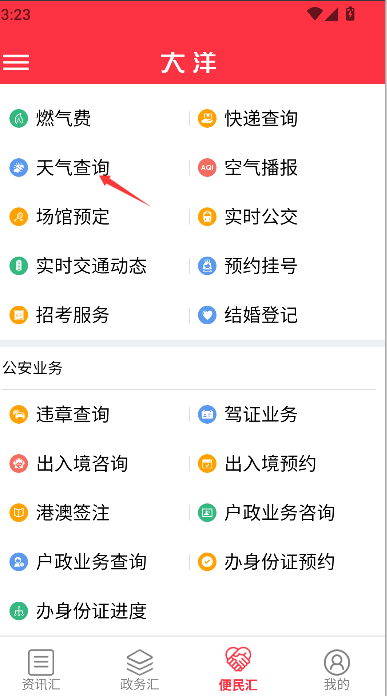 2、选择并点击“天气查询”功能按钮,进入专门的天气信息查询界面。