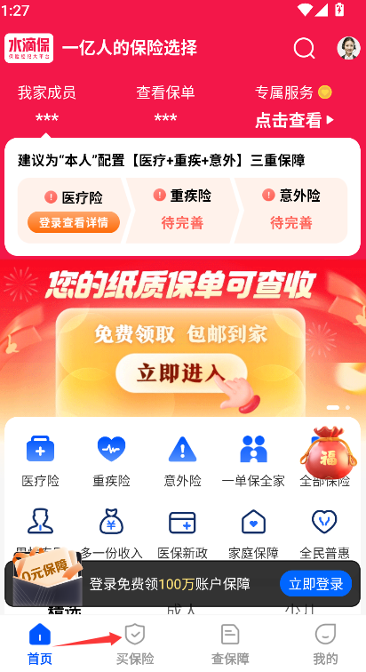 1、在底部导航栏中找到并点击“买保险”选项,进入保险产品陈列主页面。