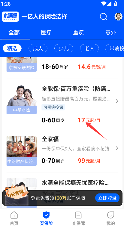 2、可浏览包括医疗保险、意外保险、重疾保险在内的多种险种分类,根据个人需求选择相应的保险产品进行了解。