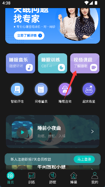 1、在应用首页轻触“视频课程”入口,仿佛推开一扇通往优质睡眠的沉浸式教学大门。