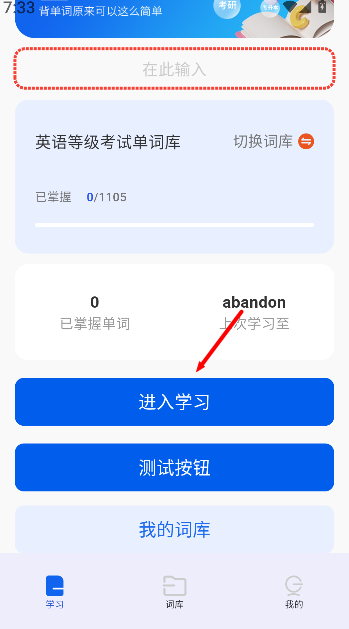 1、打开《单词斩》APP 并登录,在首页选择适配的词库(如考试、日常等类别),找到 “进入学习” 按钮并点击,进入单词学习主界面。
