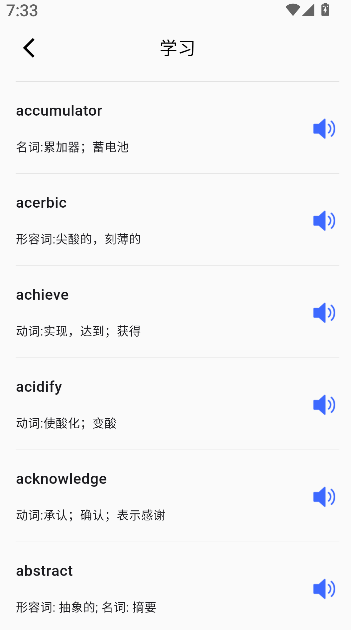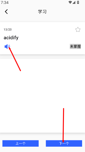 3、点击单词旁的小喇叭图标可播放标准发音进行跟读,确认掌握当前单词后,可点击屏幕右侧 “下一个” 按钮或向右滑动屏幕,进入下一个单词学习。