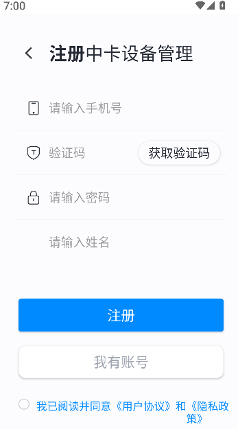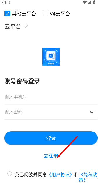 1、打开已安装完成的《中卡设备管理》APP,进入软件登录界面后,先在页面提供的选项中选择对应平台,完成登录入口确认。