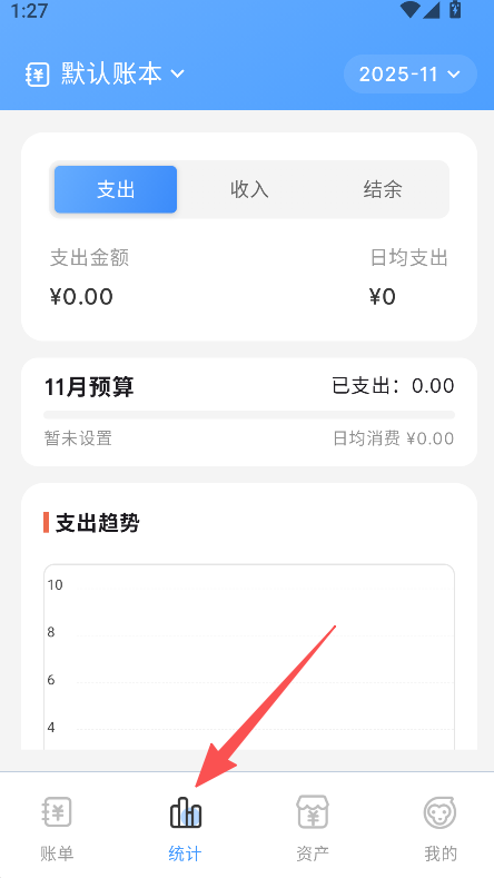 1、打开软件,点击统计,查看收支趋势与预算情况。