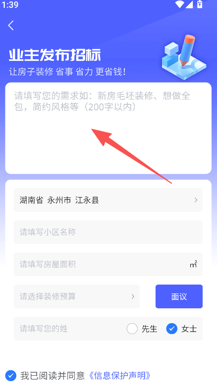 2、填写装修需求、地区、房屋面积等信息。