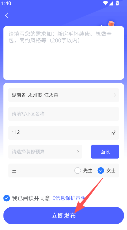 3、具备多维度信息填写功能,涵盖需求、地区、小区、面积、预算等,全面记录装修需求,为服务匹配提供依据。